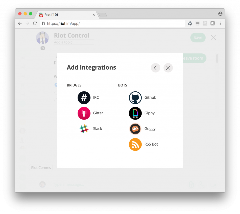 There have been vast improvements to bridging over the last few months, including the ability to "plumb" bridges into arbitrary rooms (letting you link a single Matrix room through to multiple remote networks). Like go-neb, Riot (now Element) is providing free bridge hosting with the ability to add to rooms with a "single click" via the Manage Integrations button in Room Settings. For now, Riot (now Element) is hosting any bridges built on the matrix-appservice-bridge codebase.