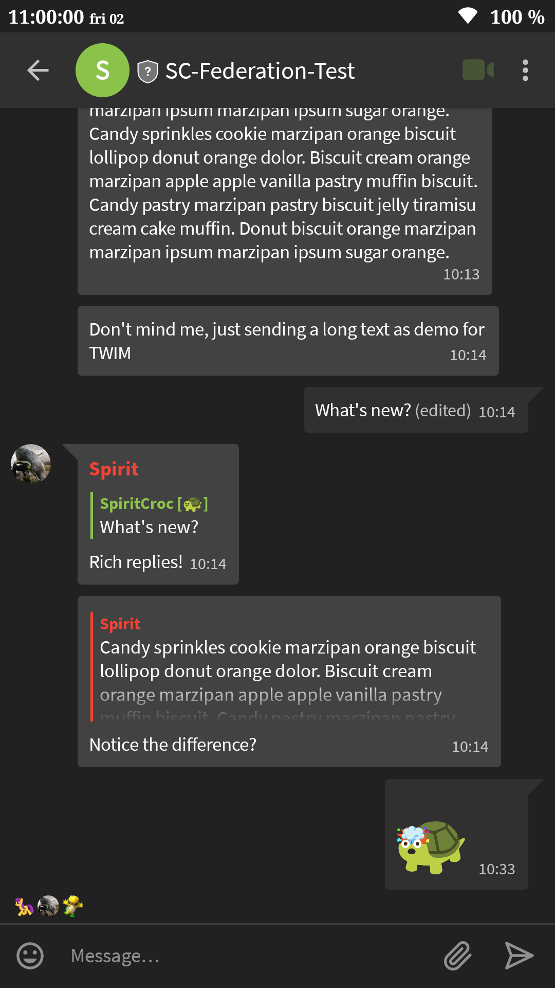 - ποΈ On the ElementX side we have been working on a Reactions picker, the timeline rewrite is almost finished, work on a split view layout for iPad continues and weβre finishing up a shiny new Room Details screen.